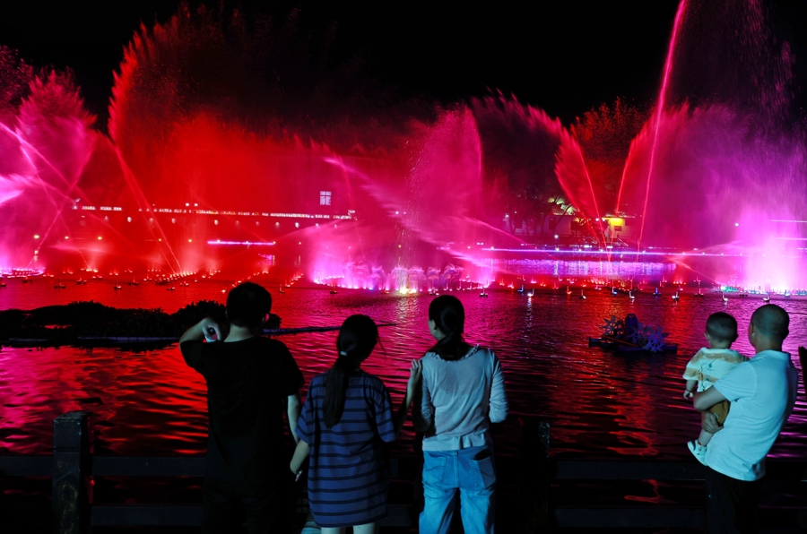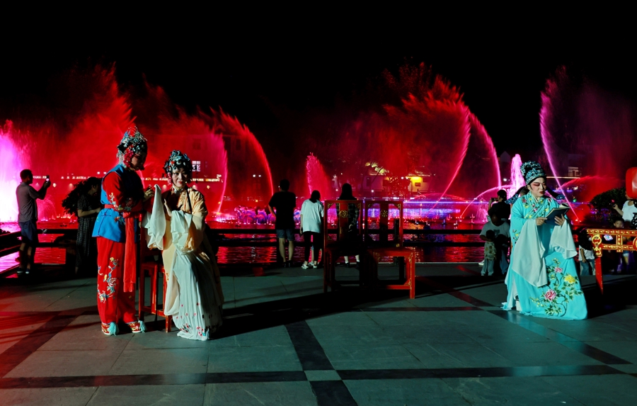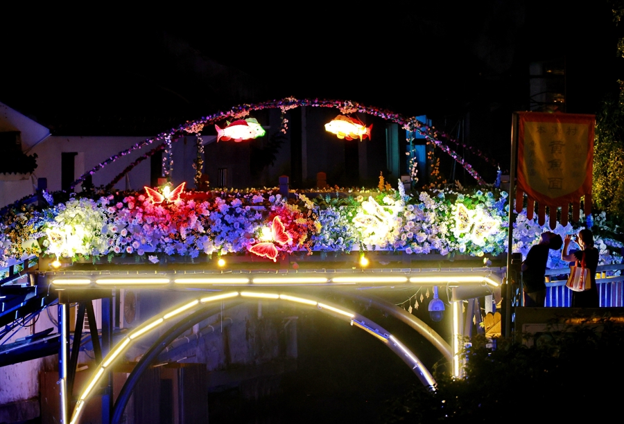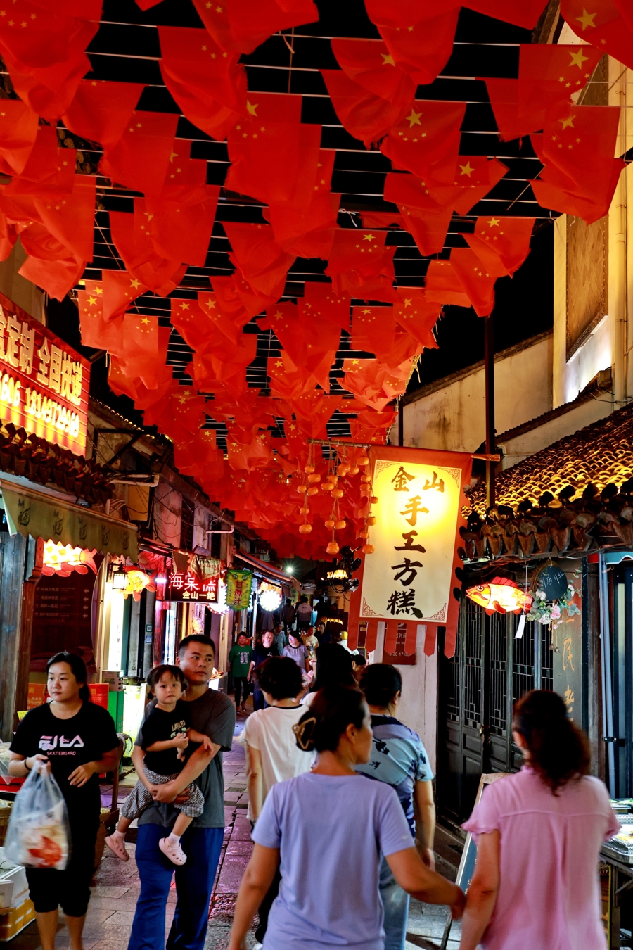 中秋之夜,在金山区金山嘴渔村祥鱼湖畔,汇集了许多市民游客,人们一边欣赏中秋明月,一边观赏音乐喷泉和戏曲表演。同时,渔村大街小巷国旗飘扬,人头攒动。整个渔村呈现其乐融融景象。
