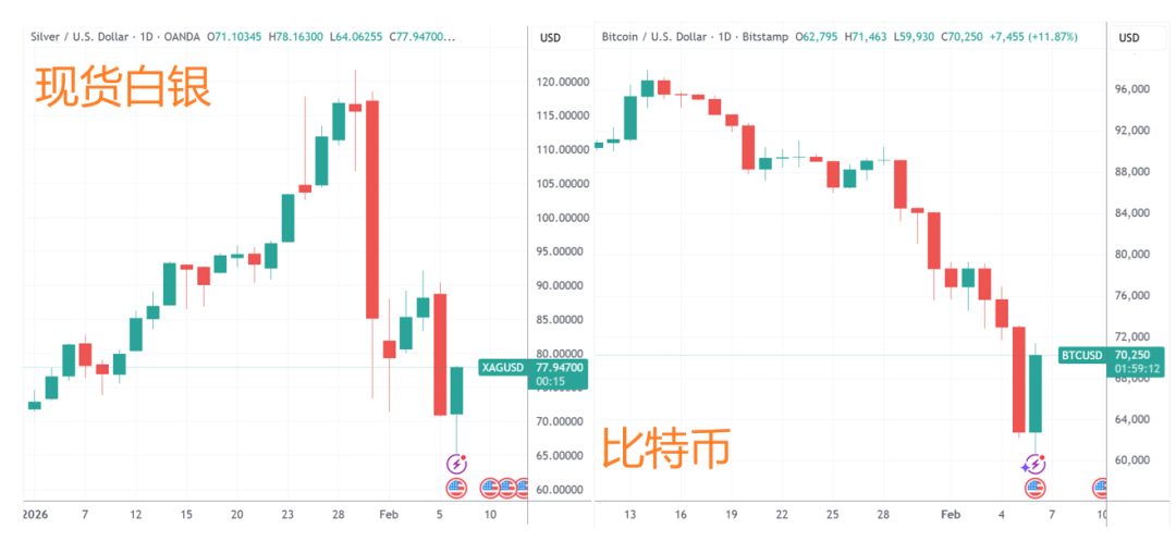 近来代表着极致风险偏好的现货白银周五反弹近10%,比特币也涨近12%。